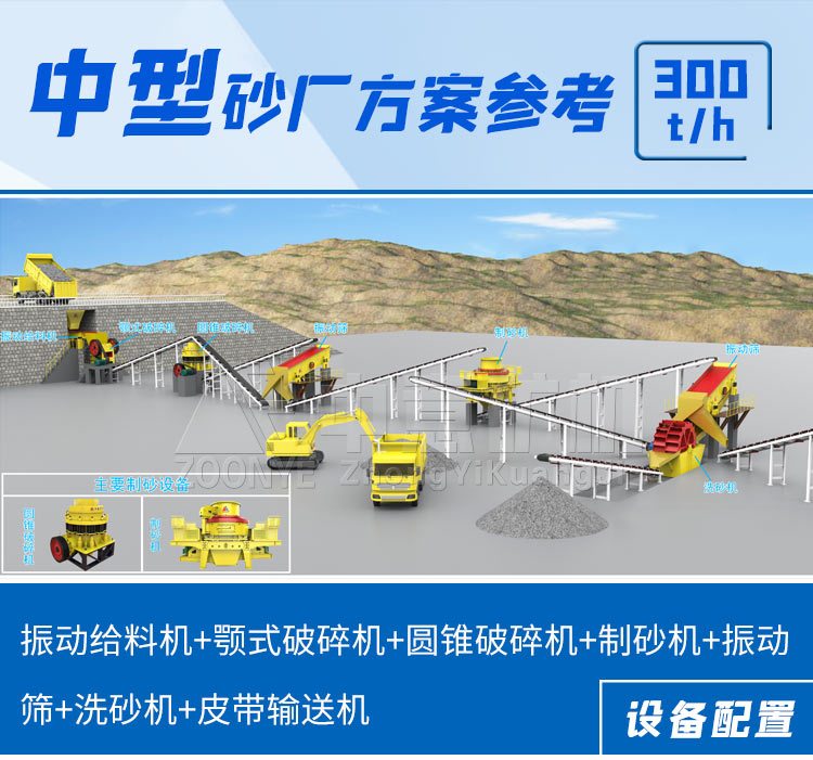 設(shè)備:顎式破碎機(jī)、圓錐破碎機(jī)、制砂機(jī)、振動(dòng)給料機(jī)、皮帶輸送機(jī)、除塵裝置、振動(dòng)篩